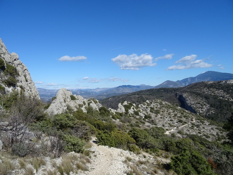 A l'approche du sommet, nous constatons que le sentier que nous suivons n'arrivera pas à la crête. Nous consultons aussitôt l'appli Multicarto ainsi que les autres tracés sur le GPS. Et décidons de modifier notre choix en suivant dès à présent un autre tracé. Il nous faut pour cela faire quelques centaines de mètres en arrière et emprunter un sentier qui, en effet, suit la direction des antennes sur le sommet. Et le Mistral ne faiblit pas. Les bourrasques par endroit redouble. Marianne en est par moment pétrifiée. A l'approche du sommet, alors que le vent redouble, il lui semble que je traîne. Son adrénaline suit le souffle du vent et ainsi dopée elle me pousse au cul.