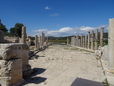 Vers 14h, nous nous dirigeons vers le site archéologique. Le billet d'entrée donne accès à la plage obligatoirement payante. Le prix initial de 30 Lires est passé à 200 Lires, une fois de plus... Une partie est interdite aux draps de bain, car les tortues viennent y pondre en cette saison. Le site est loin d'être aussi grandiose qu'à Ephèse ou Pamukkalé, mais c'est intéressant quand même. Nous finirions par prendre goût pour les vieilles pierres. Certaines ruines ont été restaurées car enfouies dans le sable durant des siècles. D'autres ont été partiellement reconstruites, mais parfois un peu en dépit du bon sens: ainsi des colonnes ont été utilisées comme linteaux, !!! ...